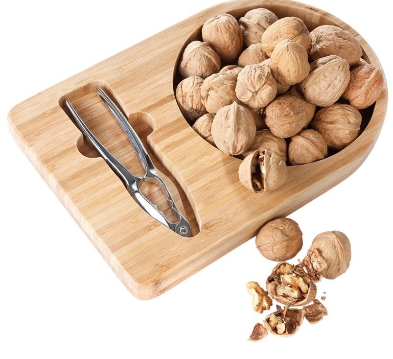 Just what you need to keep your favorite nuts and the nutcracker all in one place and ready to serve. The compartment for nuts measures 6-1/2" dia. x 1" deep. Next to that is the nutcracker compartment. The Bamboo Nut Tray measures overall: 11-1/4" x 7-5/8", 1-1/8" thick.
